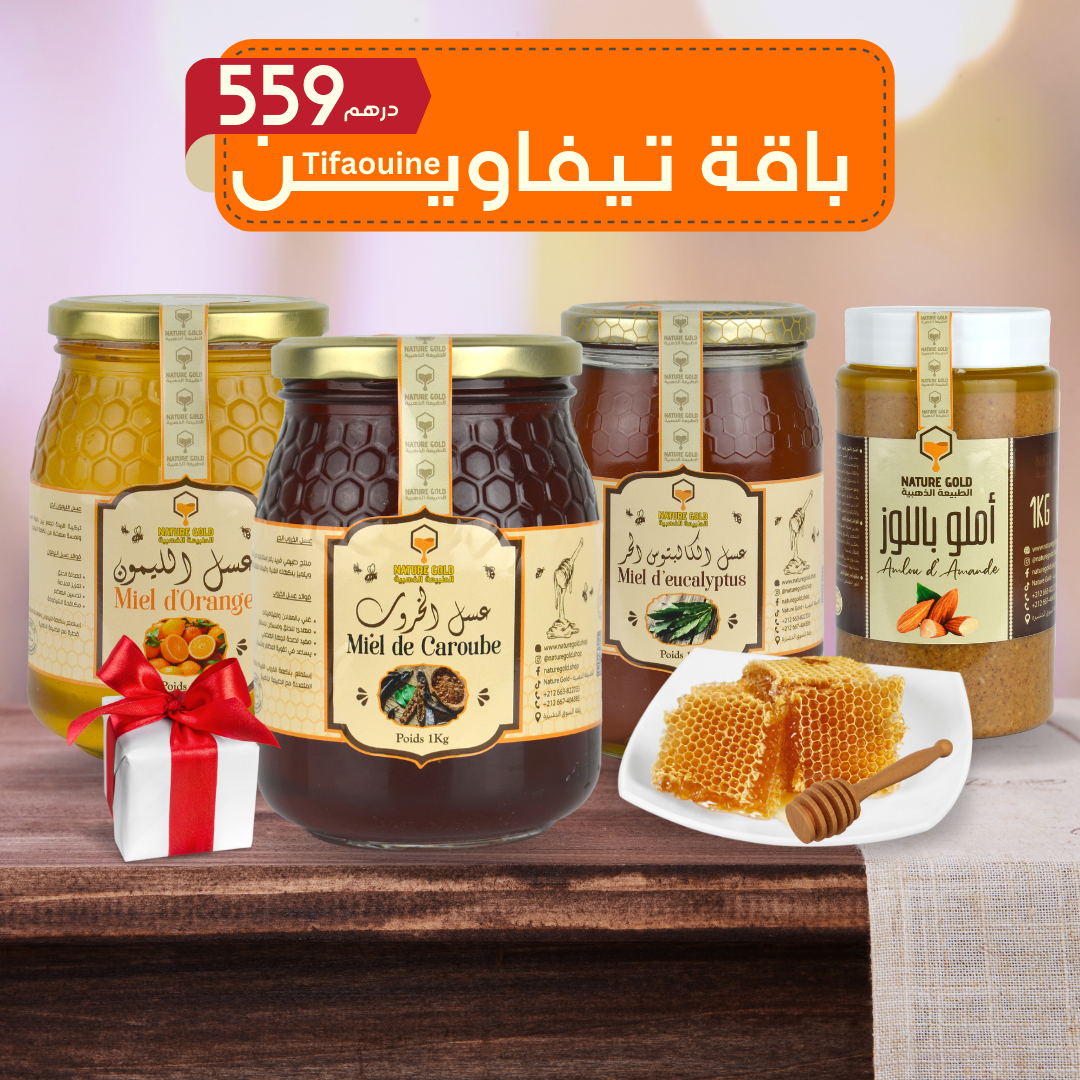 - كيلو عسل الكاليبتوس الحر: مستخلص من زهور شجرة الكاليبتوس التي تنمو في مناطق نائية ونقية في المغرب. هذا العسل يمتاز بخصائصه المضادة للبكتيريا والفطريات، وهو معروف بتأثيره الإيجابي على الجهاز التنفسي. يبرز بطعمه المميز ورائحته العطرة التي تأخذك في رحلة إلى أحضان الطبيعة المغربية.